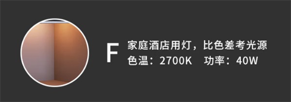 F光源是模拟的夕阳光,其色温为2700K,是一种黄光源暖色系列、主要用于家庭酒店灯光色,是比/对色参考光源,通常建议灯管型号为GE40WE27。