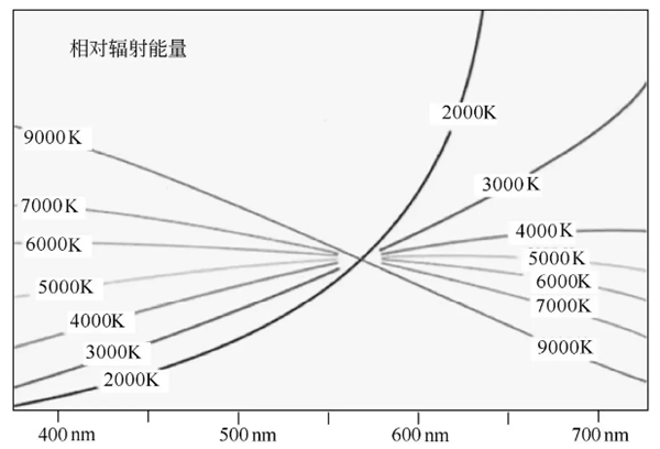 图3-1显示出理想的黑体辐射的各种色温与相应的光谱曲线。日光、白炽灯、日光灯等实际的光源都只是在不同程度上接近黑体,因此采用最接近的黑体色温表示这些实际光源的外观颜色,称为光源的「相关色温」,简称「色温」。在数码相机中也常用色温代替光源的类型设置白平衡。