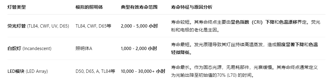 不同类别的标准光源灯管,由于其技术原理和设计目标的差异,其有效使用寿命范围各不相同。下表列出了常见类型灯管的典型寿命参考值。