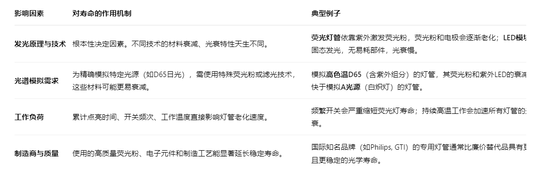 多种因素共同决定了标准光源灯管的实际使用寿命,其根本原因在于不同灯管的设计目标和技术路径不同。