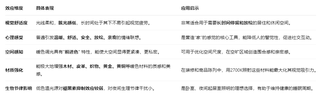 2700K光源的广泛使用源于其独特的视觉与心理效应,这些效应已被广泛研究和应用。