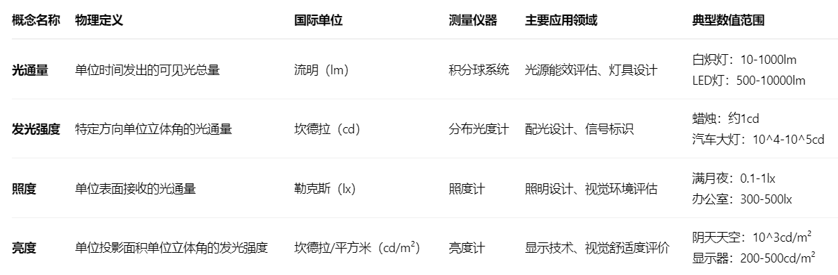 亮度相关概念构成了光学计量和视觉科学的基础体系,准确理解其内涵与区别是进行科学光照设计、视觉评估和光学测量的前提。这套概念体系通过严格的数学定义和物理量纲,将主观的亮度感知转化为可量化的客观指标。
