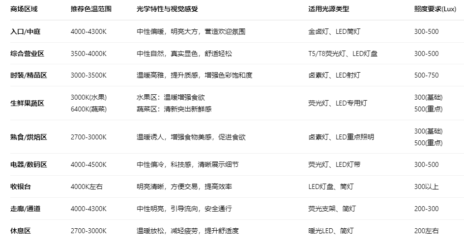 表:商场各区域光源色温对照与应用指南