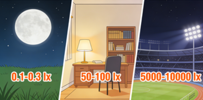 户外环境:晴朗夏日正午阳光下达100,000 lx,而满月之夜的地面照度仅约0.2 lx。