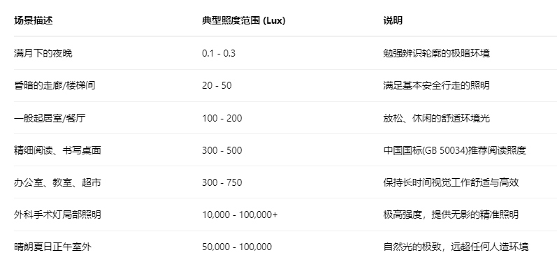 勒克斯值将抽象的“亮度”转化为可感知的具体数值。以下是一些常见场景的照度参考,可帮助我们建立直观感受:
