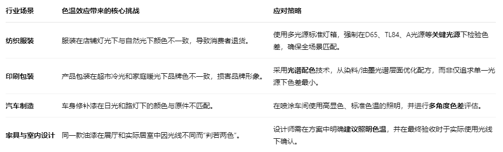 这种影响是系统性的。例如,在服装店的暖光(3000K)下,一件米色外套可能显得温馨雅致;但在商场的冷白光(4000K)下,同一件外套可能呈现出偏灰、偏冷的质感。这种“一物多色”的现象,正是零售行业必须通过标准光源箱(模拟多种照明环境)进行严格对色的核心原因。