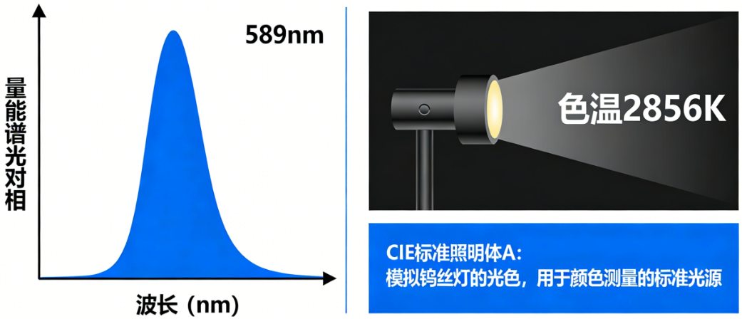 CIE标准照明体A最初在1931年被定义为温度Tem-2 848K的普朗克辐射体的相对光谱功率分布,彼时第二辐射常数c:取cz.cEn-14 350 gam・K.公式(1)给出的定义形式经过精心选择,以确保CIE标准照明体A被定义为相对光谱功率分布而非温度的雨数。如4.1所述。自1931年以来,相对光谱功率分布的定义一直没有改变,公式(1)只是以通用形式对其进行表达。
