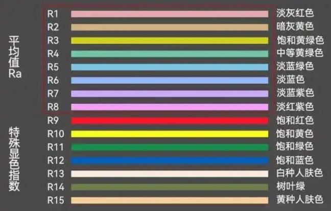 Ri(特殊显色指数):对 Ra 的补充,针对 R9–R15 某一种特定颜色,比如 R9(红色还原能力)、R15(亚洲人肤色表现),是 “专项评分”。