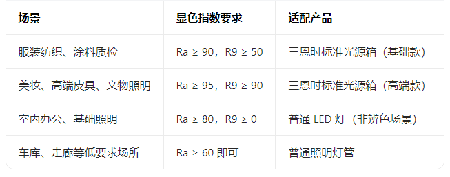 不同行业、不同场景,对显色指数的需求不一样,提前对应好,避免选错灯: